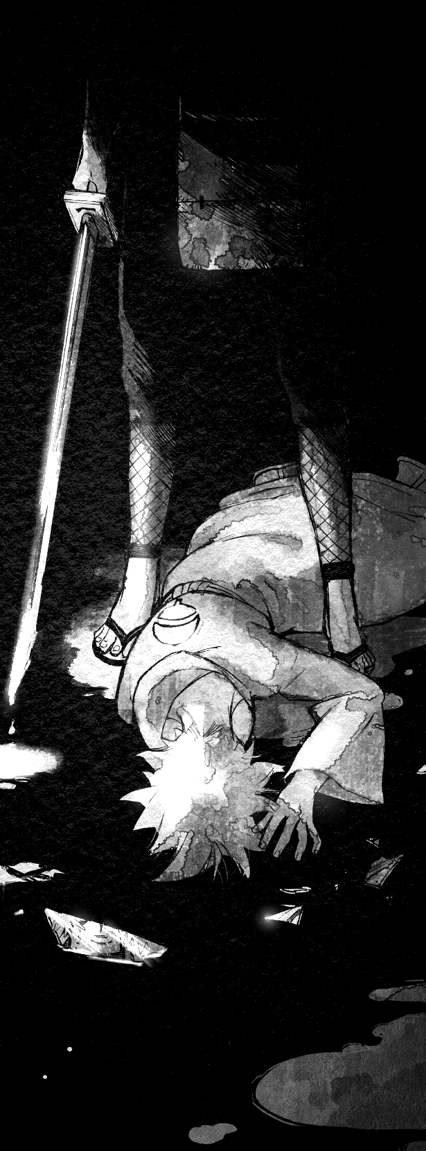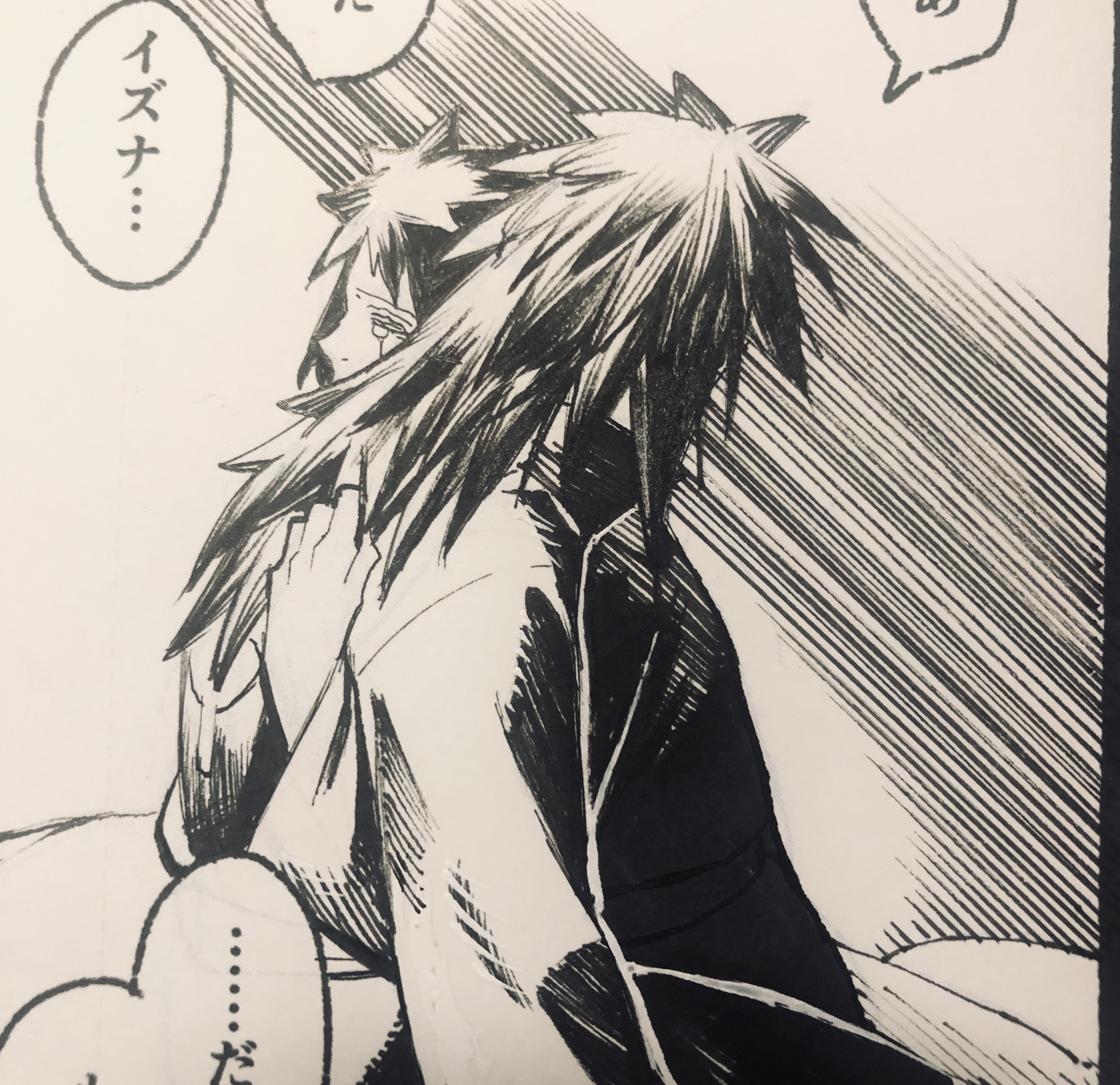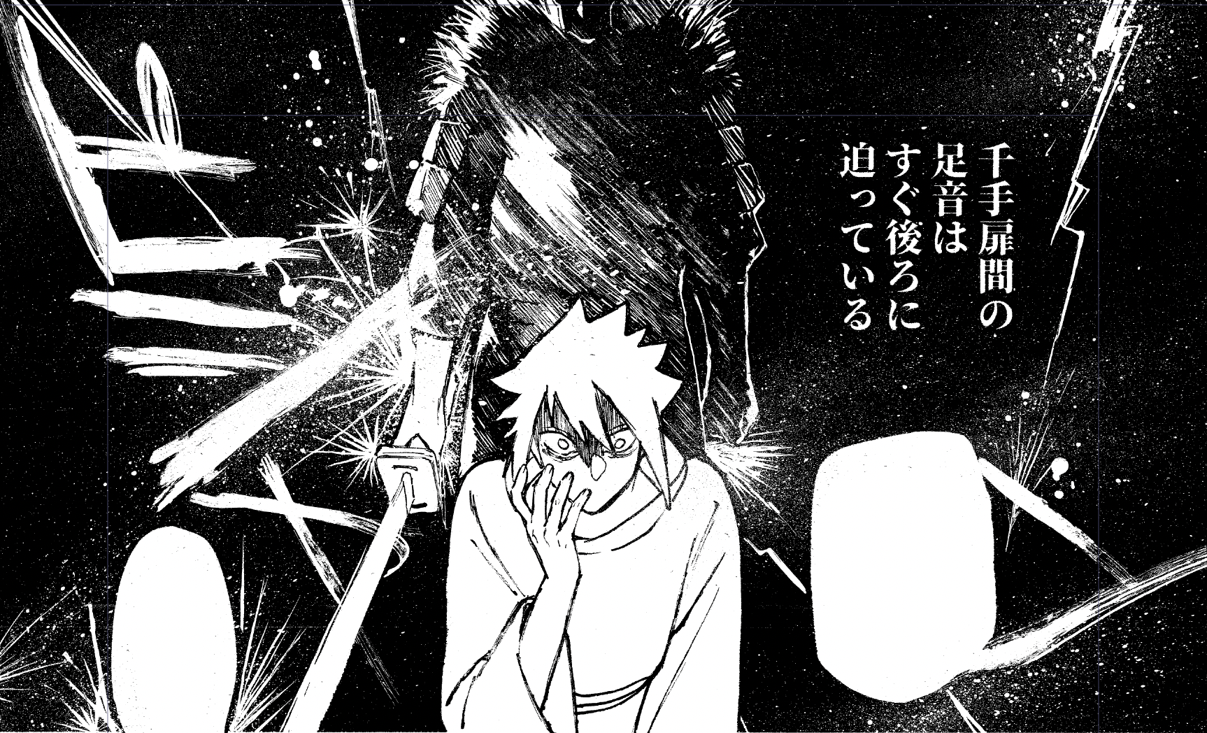 マダラさんの髪の毛は多肉植物ぽくて(ベタ大変ですが)描くの楽しいです。このコマ、背景の光線入れる前のも撮影しておけばよかったな…