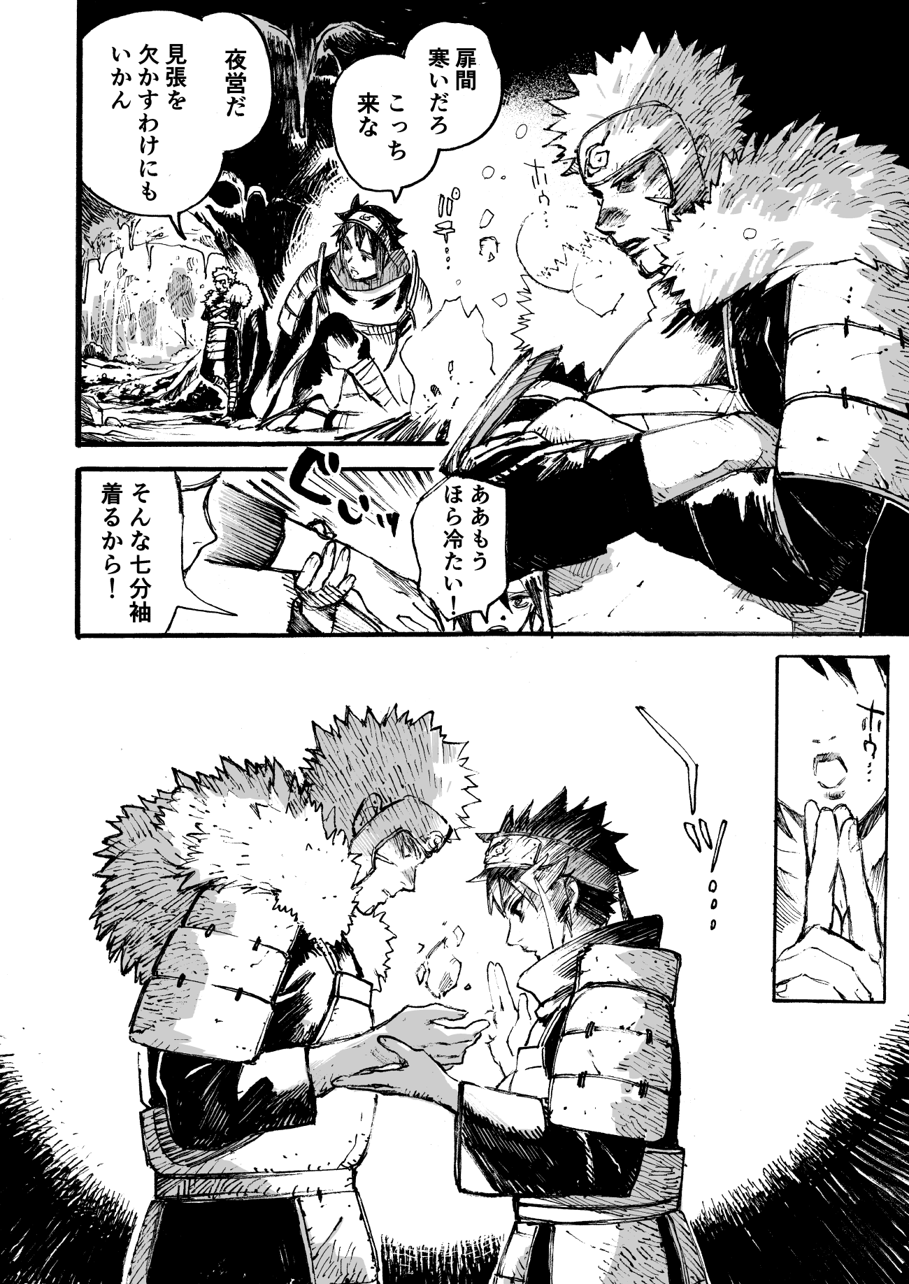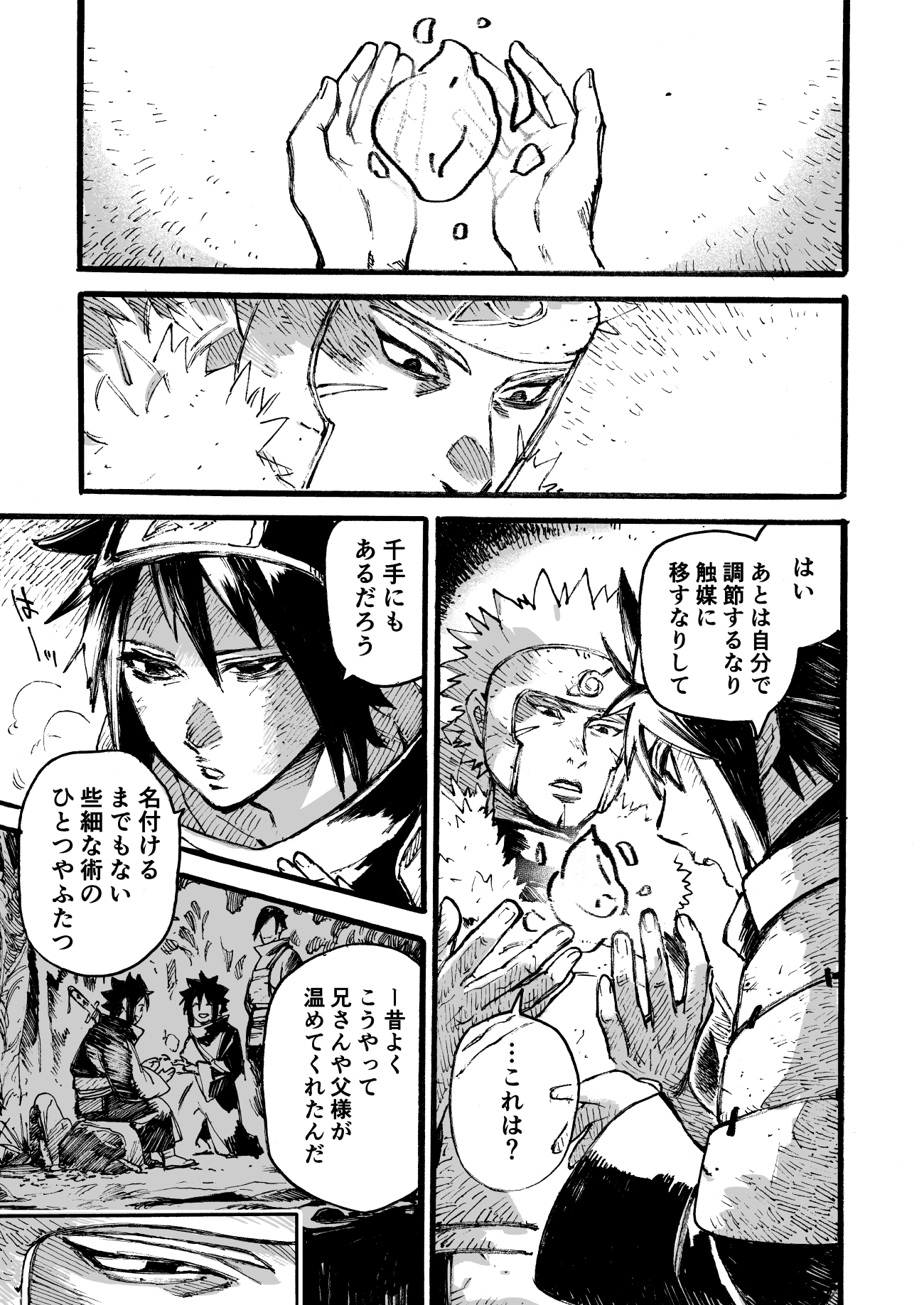 寒い一日に沁みる素敵な絵をありがとうございましたの気持ちと、戦国時代や創設期よりもずっと前からうちはで紡がれてきた名前もない風習(という名の暖かい心)があったらいいなの気持ちで描きました。