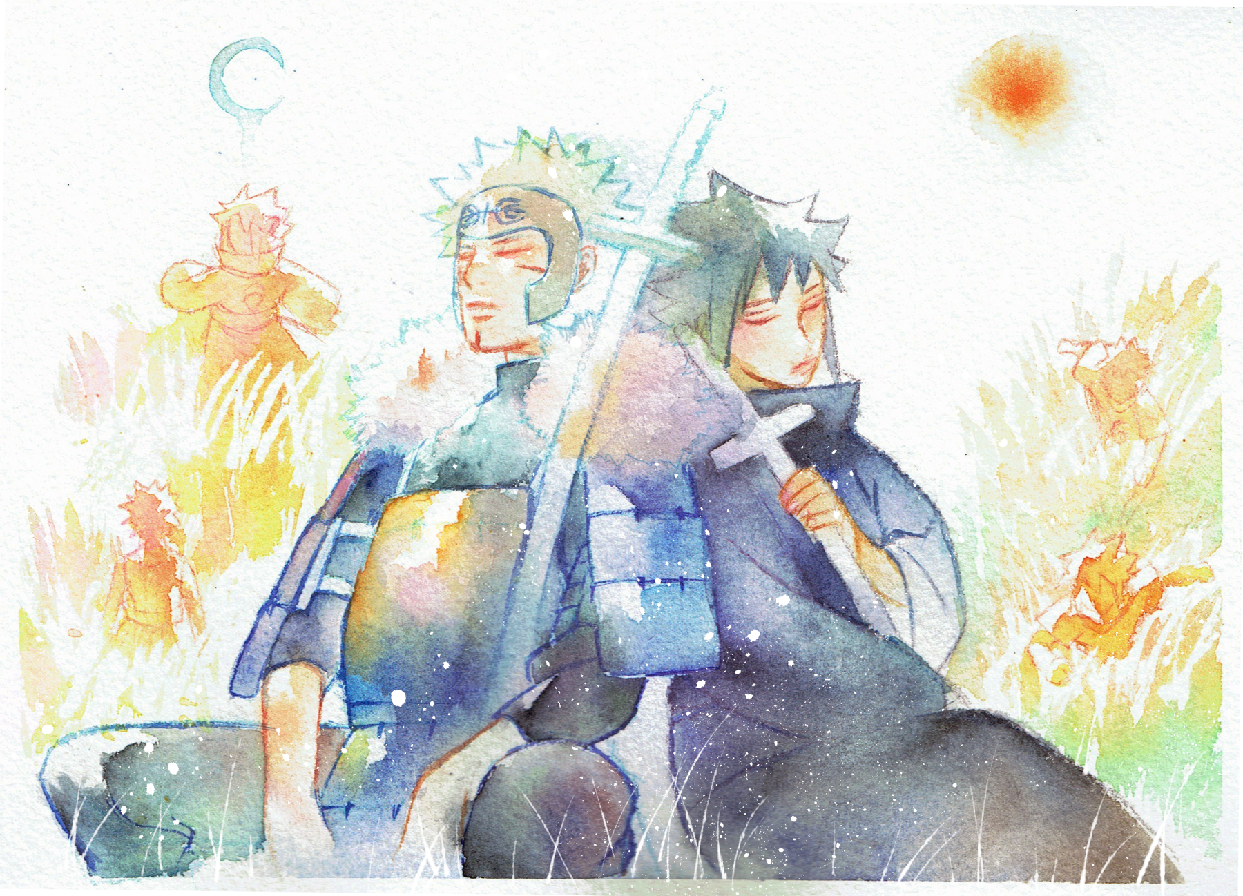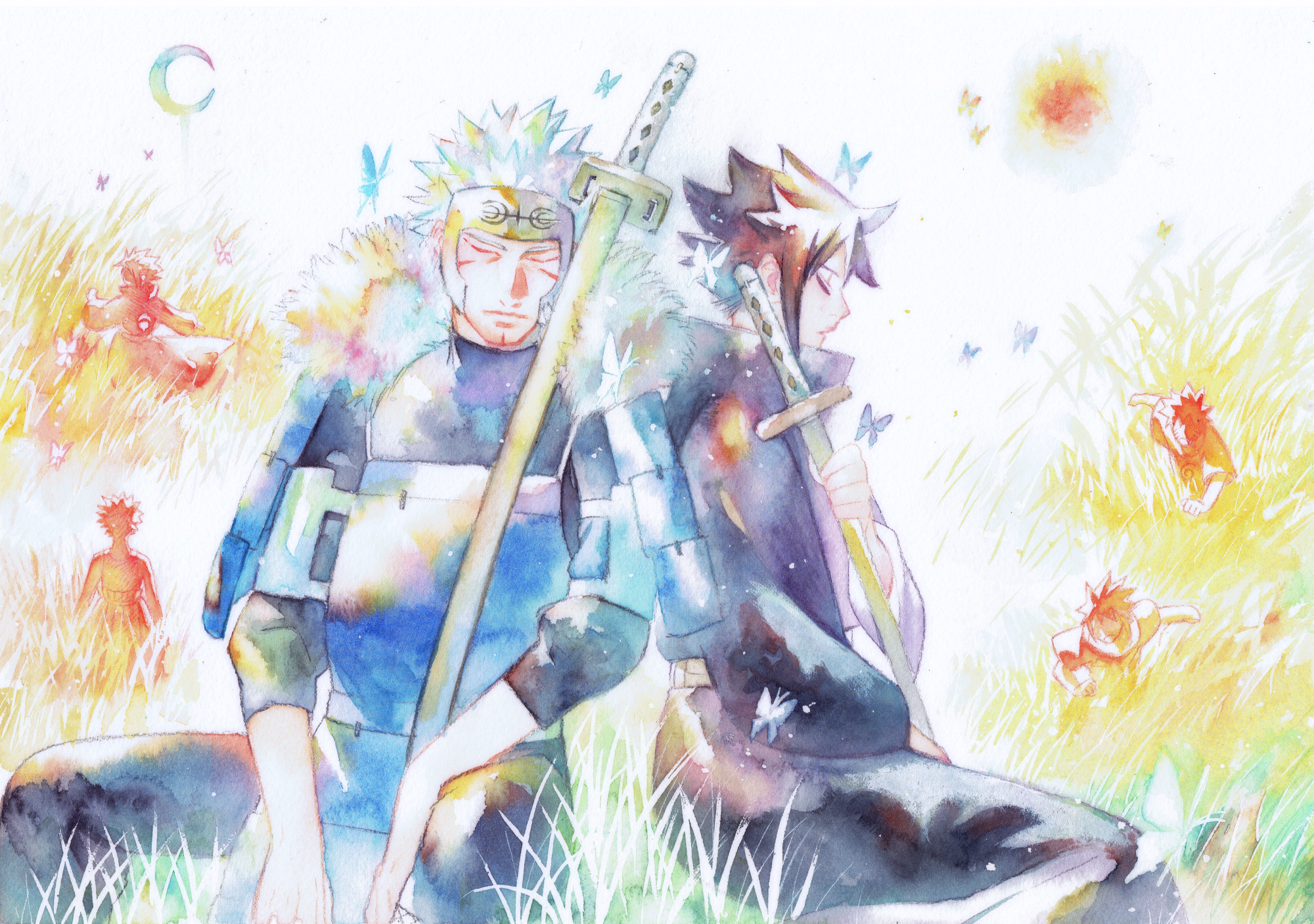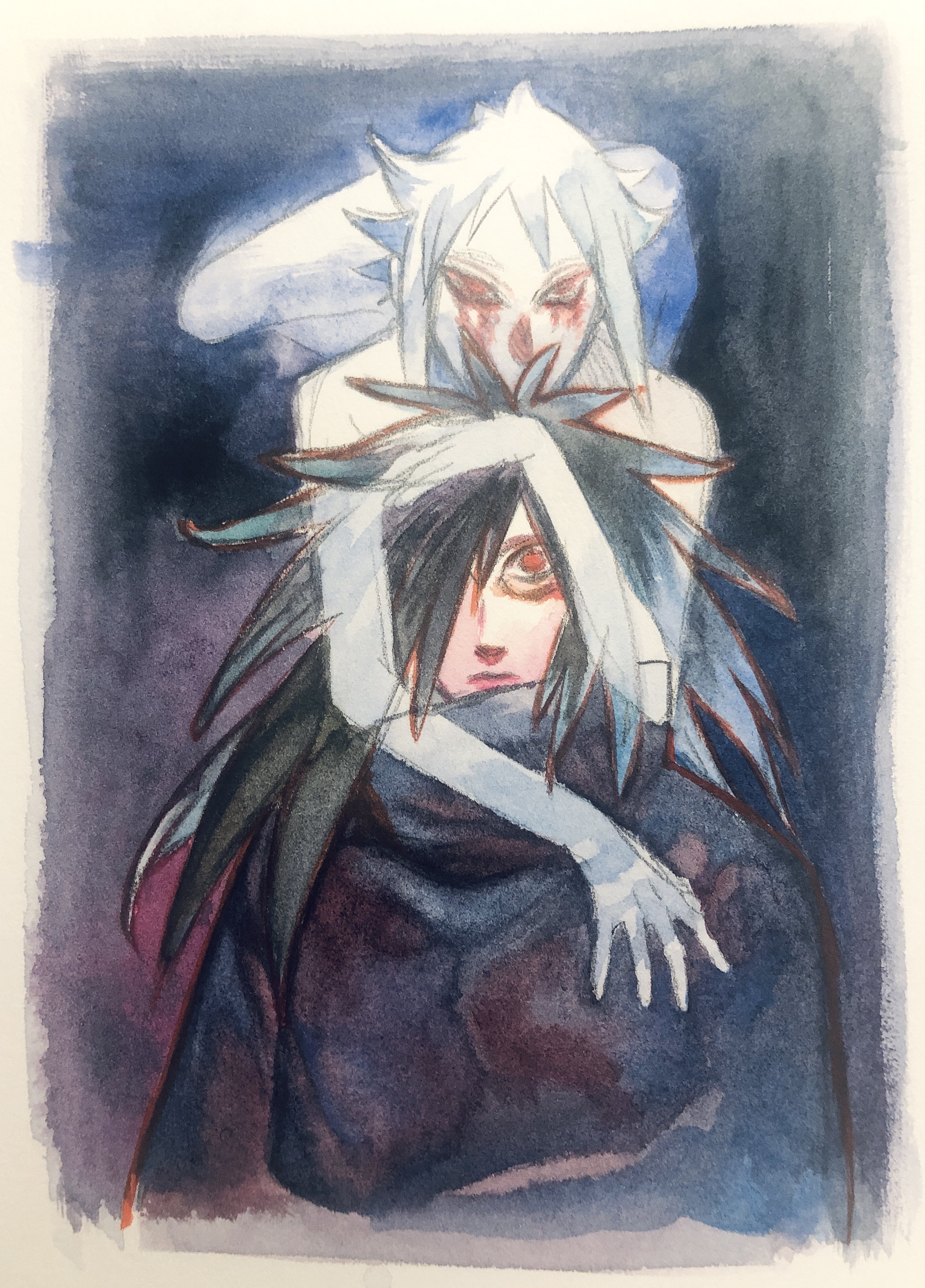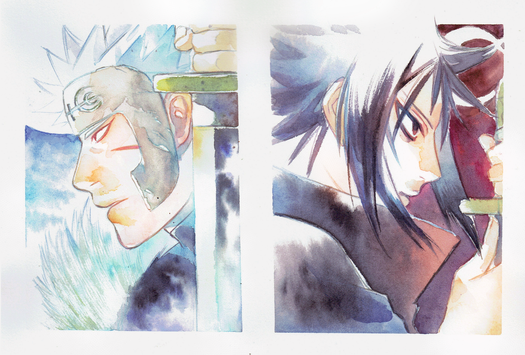 大きめのアルシュ紙にマスキングとか本格的に使って描いたので楽しかったです〜扉間さんの足回りはかなり綺麗な色が出せたような