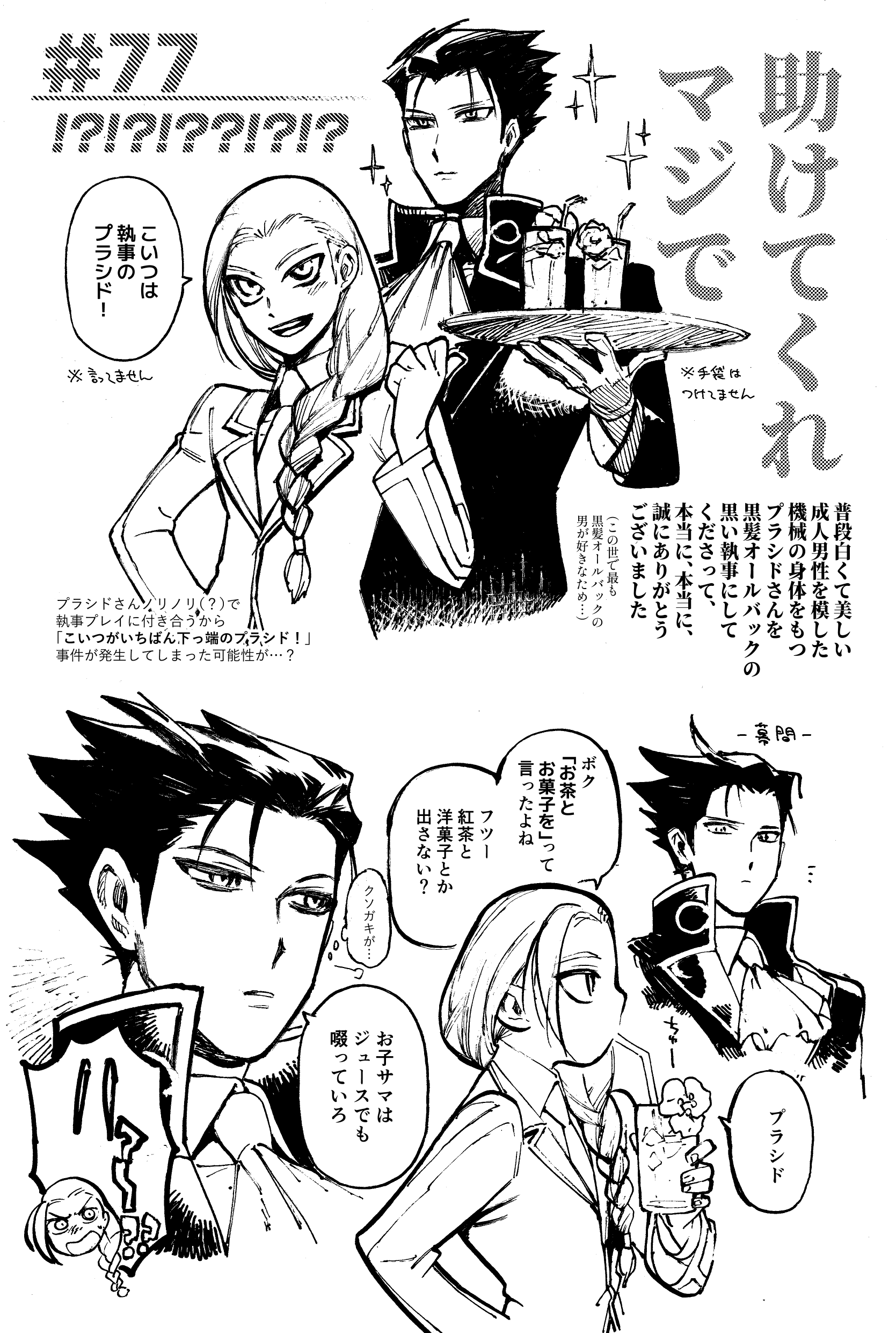 でも我慢できなくて カイチャッタ……だって白くて美しい成人男性を模した機械の身体をもつプラシドさんが黒髪オールバックの黒い執事になって出てきたら暴れるだろ!!!!!!!(困惑)(激怒)(感謝)(萌えギレ)興奮のあまり誤ってプラシドさんに手袋つけちゃったんですが実際はありません 執事のコスプレしたのは""公式で事実""なのに手袋してないのは嘘ってもう意味が分からないよなんなんだよ通常プラシドさん描く前に執事verがっつり描いちゃったよ助けてくれよマジでどうすんの?これ